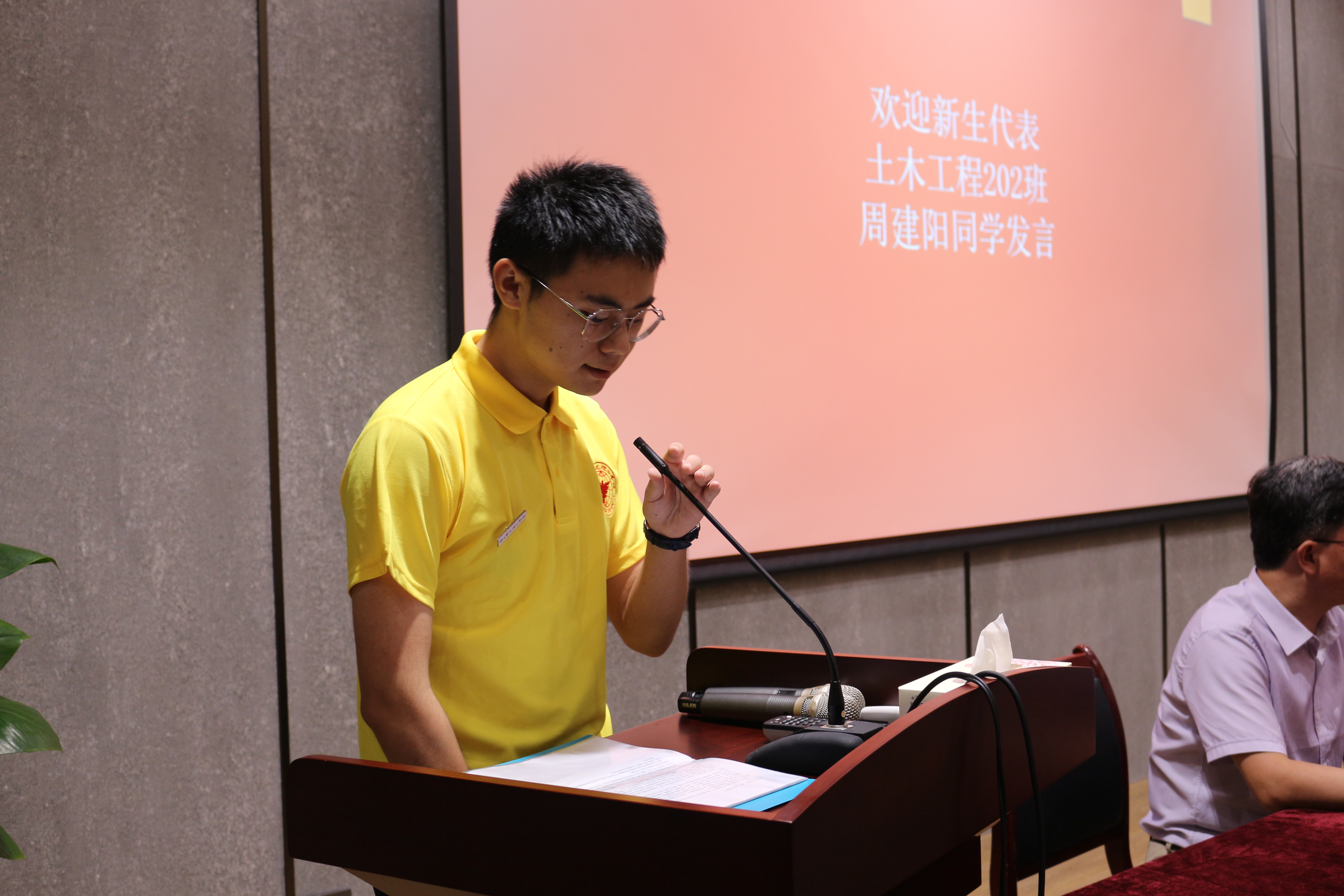 新生代表土木202班周建阳发言,表达了对考上土木工程专业的激动之情,并展望了未来大学的生活。