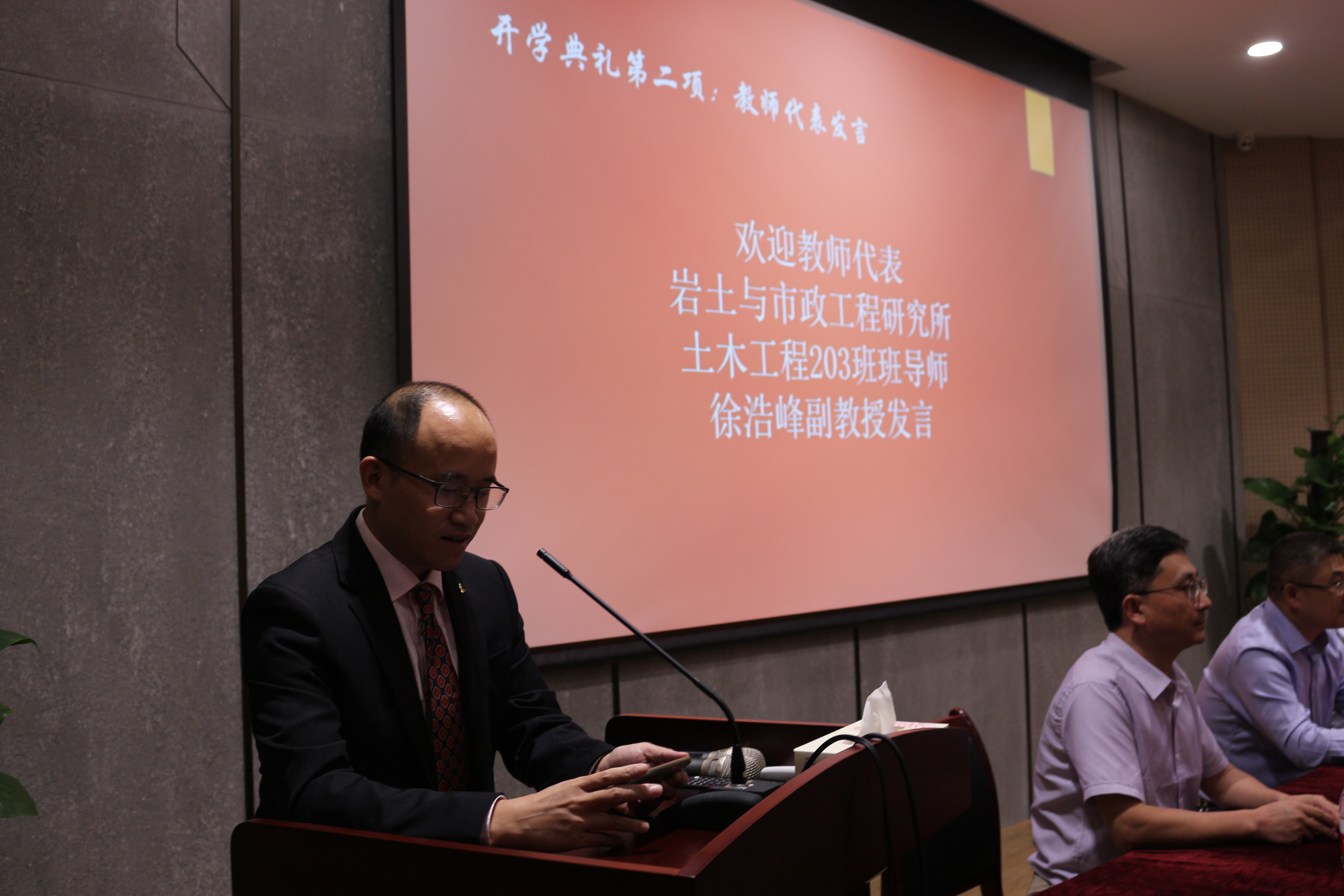 徐浩峰老师作为教师代表发言。他以“人生新旅程,迎接新挑战”为题,由新冠疫情引出土木工程是中国抗疫精神的重要组成部分,土建人是地球这块集成电路中元器件和线路的设计者施工者,土建行业前途无量,意义非凡!