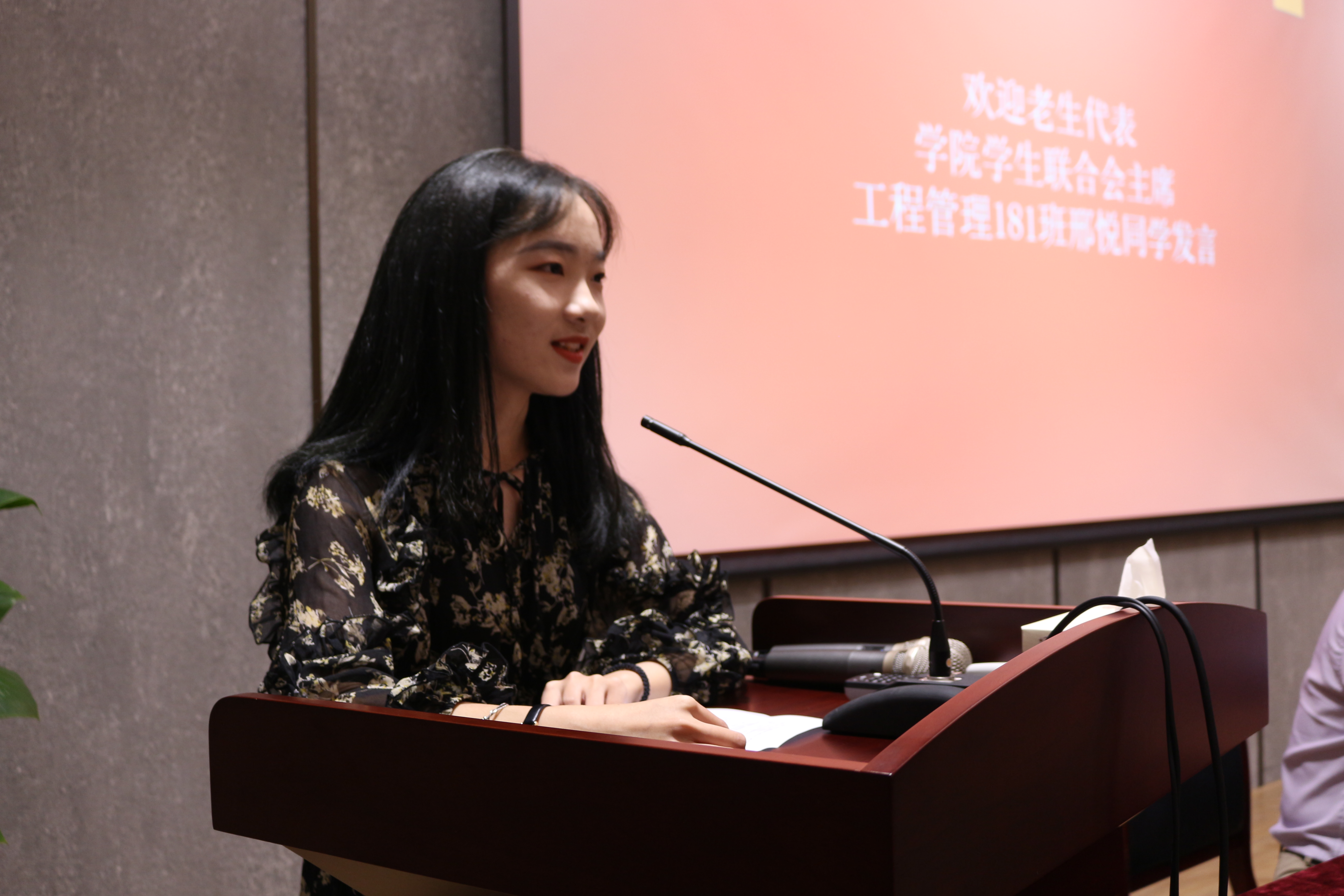 学生代表院学生会主席邢悦发言,她分享了大学这两年来的感悟:大学生活相对自由但自由并不意味着散漫,做人做事不忘初心方得始终。