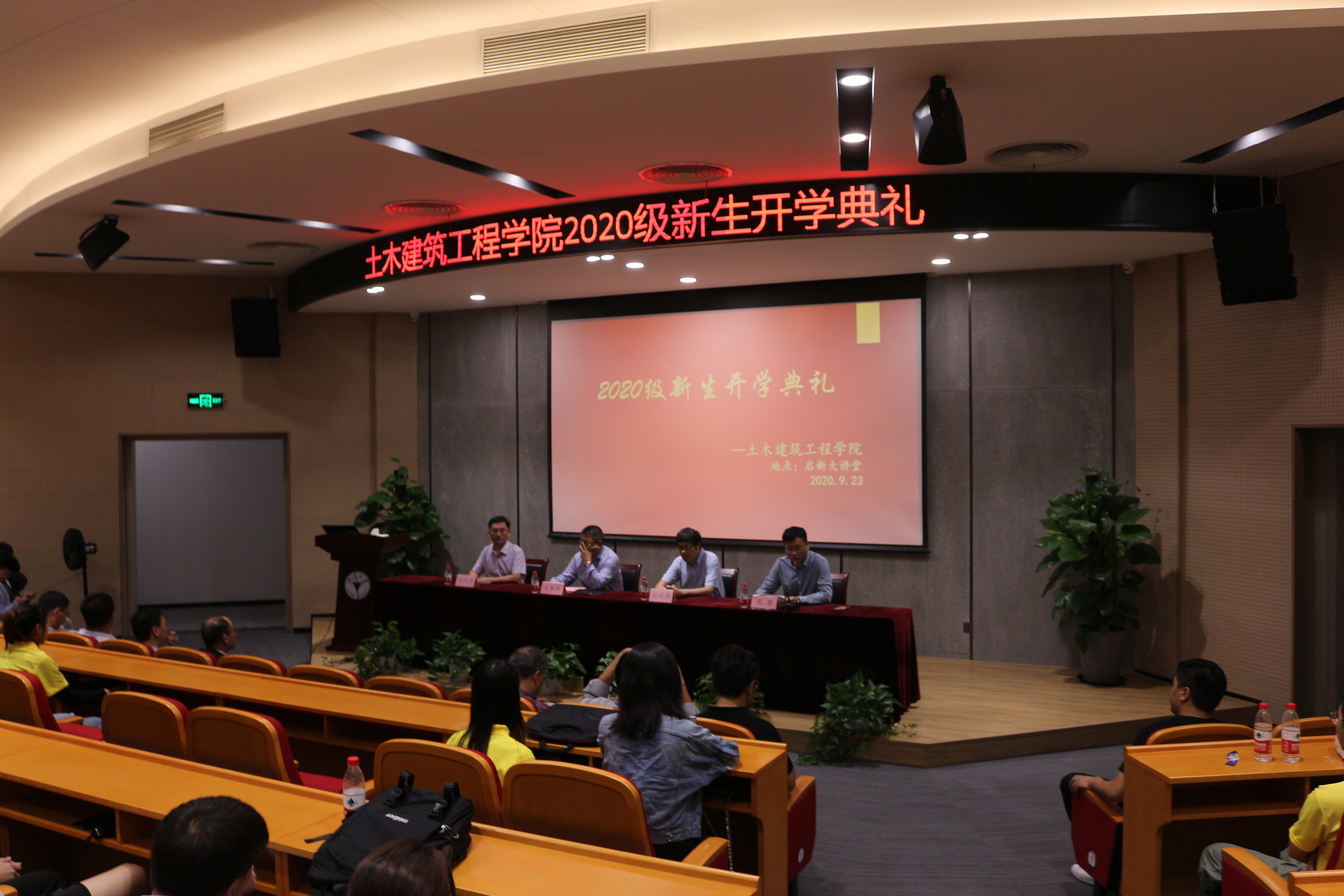 2020年9月23日晚,土木建筑工程学院在启新大讲堂举行了2020级新生开学典礼。土木建筑工程学院党委书记王银辉、副院长张科锋,副院长王文军,各研究所负责人以及新生班级的班导师和辅导员们出席了此次典礼,20级全体新生参加。典礼由学院院长助理、工程管理研究所副所长耿健老师主持。