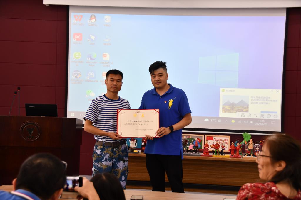 活动伊始,土建学院特聘请黄铁军老师为学院的“砼心导师”,辅导员张腾老师为黄铁军老师颁发聘书。随后黄铁军老师开展以“青春无悔心向党,逐梦深蓝塑军魂——非遗面塑走进一带一路”为主题的专题讲座。讲座中他讲述着在自己十六年的军旅生涯中如何把面塑技艺发扬、推向世界,还描述了他随军出访欧洲、非洲的所见所闻。赢得了师生们的阵阵掌声。之后黄铁军老师向现场的师生教授面塑的基本技巧,并和师生们一同创作建党百年的面塑作品。活动最后黄铁军老师还展示出他近期完成的一些作品,并和现场师生合影留念。