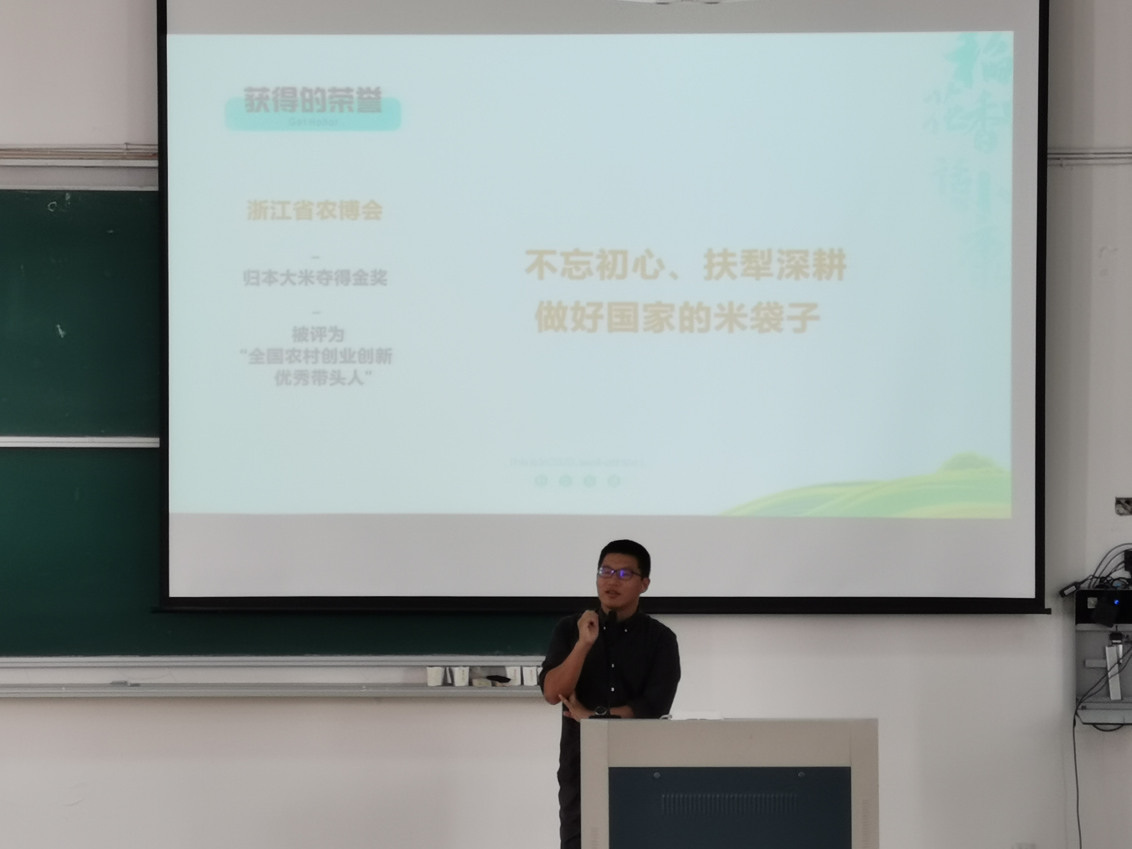 鄞州90后大学生“种田郎”汪琰斌结合自身事例——归本大米向同学们讲述了农民这一职业的定义,他说到,农业是一个产业,是一个能让国家实现共同富裕的产业,在国家乡村振兴战略等政策的引导下,农业一定会成为前途光明的职业,农民也一定会成为最体面的职业。
