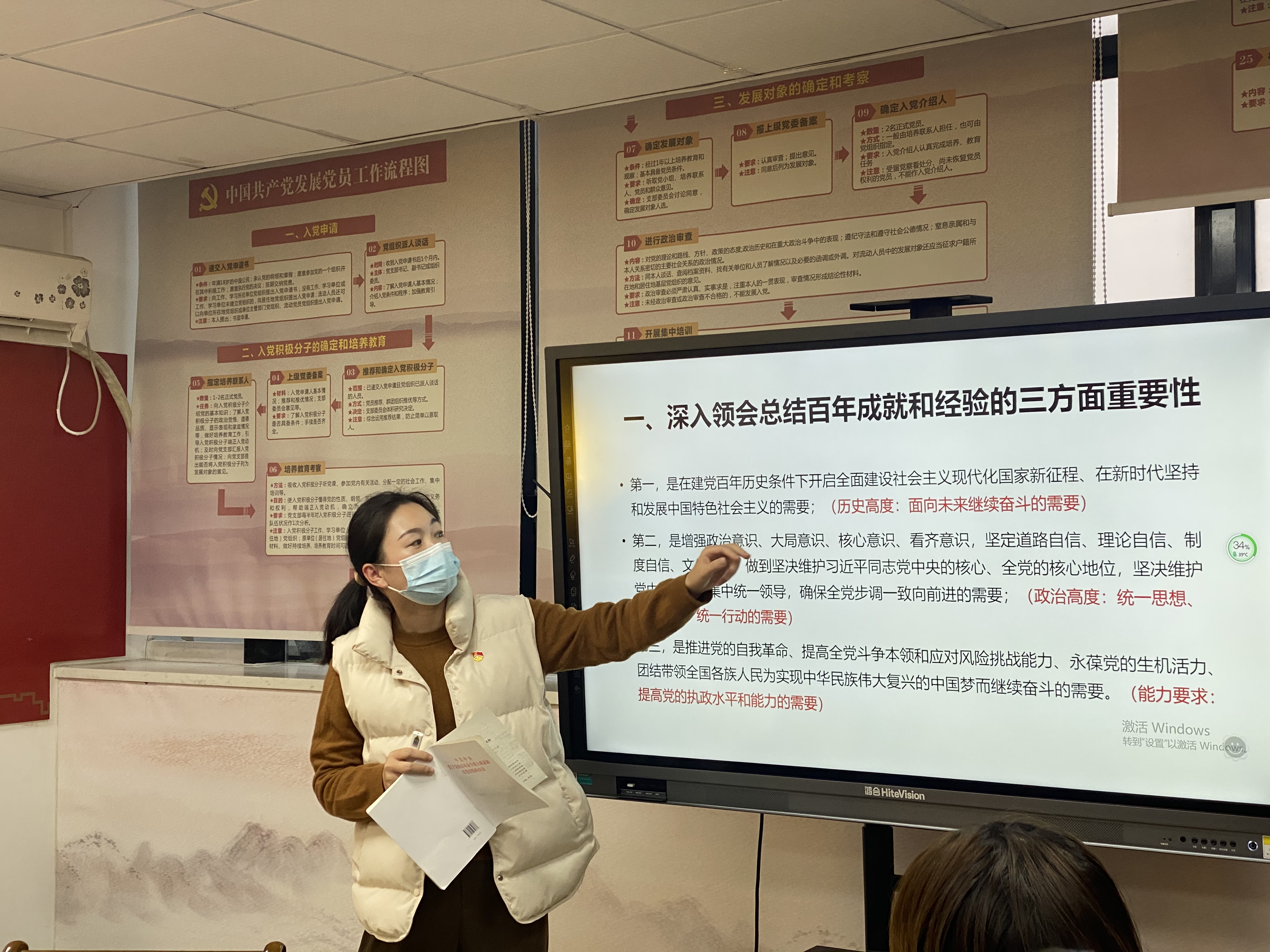 在周老师的带领下,支部党员进一步学习了马克思主义中国化的发展历程,明确了党的百年奋斗重大成就和历史经验的各个要点,进一步拓展了对党史的认识。会后,支部党员一致表示,今后将继续深入学习贯彻党的十九届六中全会精神,从党的百年奋斗历史中汲取经验和力量,以实现中华民族伟大复兴为己任,增强做中国人的志气、骨气、底气,不负时代,不负韶华,不负党和人民的殷切期望。
