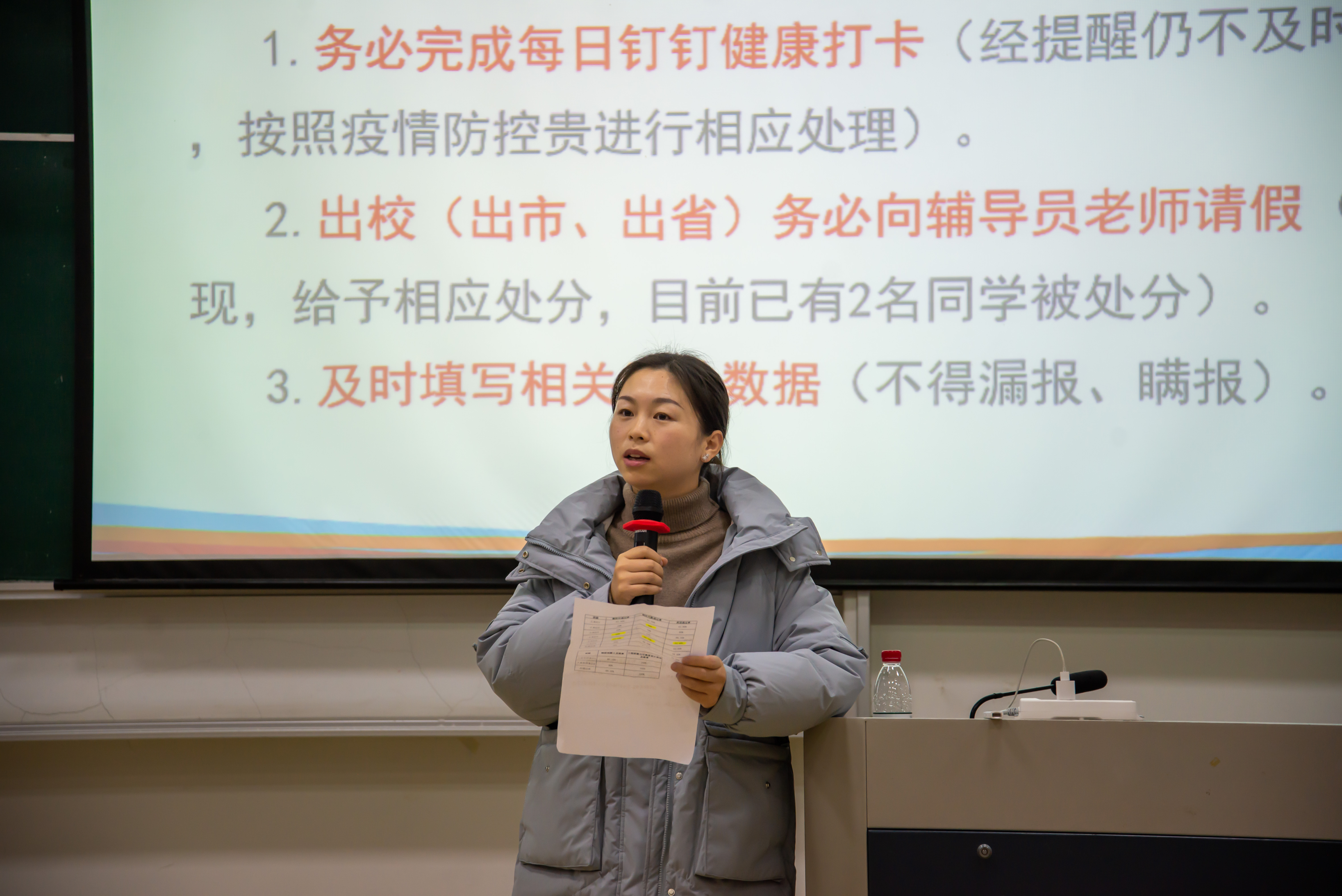 张腾老师提醒大家遵守疫情防控规定,每天按时钉钉打卡,有事出校需要履行请假制度,不隐瞒,不谎报行程。遵守网络行为规范,文明上网,不造谣、不信谣、不传谣。提高警惕,谨防电信诈骗,谨防寝室安全事故,谨防财务丢失。还提出希望同学们关注国家大事,树立远大理想,积极向党组织靠拢。
