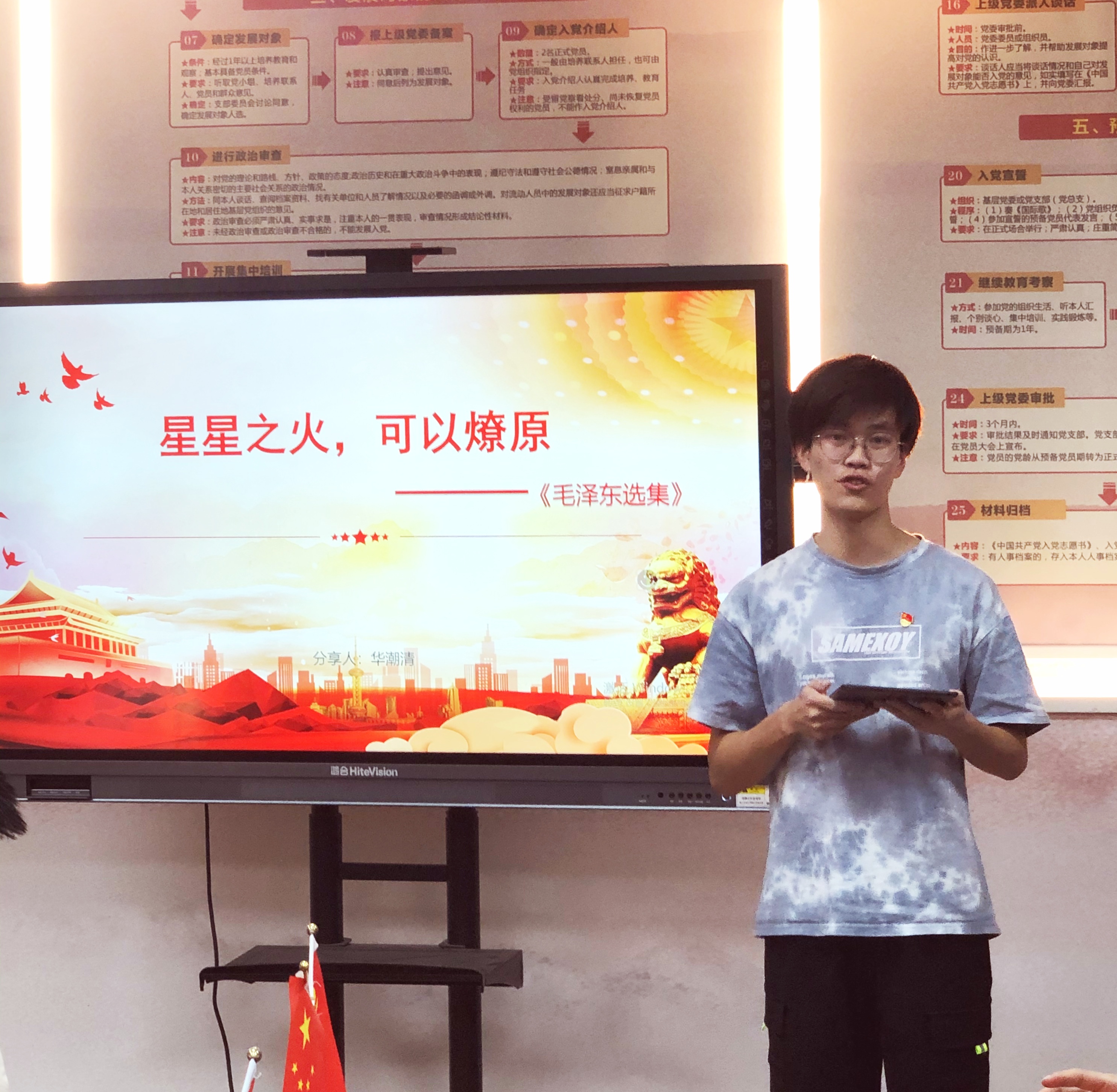 分享会上,支部党员华潮清颂读了《毛泽东选集》第一卷中的《星星之火 可以燎原》章节。他说道,“星星之火,可以燎原”,是以毛泽东为代表的中国共产党人从中国具体国情出发,科学地分析时局,对中国革命规律充分认识基础上作出的科学预见,鼓舞了无数革命者的战斗意志,激励中国共产党人前赴后继。他接着分享了《毛泽东选集》的读书心得,就该书出版的历史背景以及章节内容向在座同学进行详细介绍。他表示,自己通过阅读《毛泽东选集》,对于文字背后的红色历史故事和凝结的伟人思想结晶产生了更加浓厚的兴趣,对于我们的党史有了深刻的学习认识,进一步坚定了自己的理想信念。支部其他党员也纷纷表示通过华潮清同学的读书分享,感受到了红色书籍的魅力,感悟到新时代、新征程中自己的使命担当。