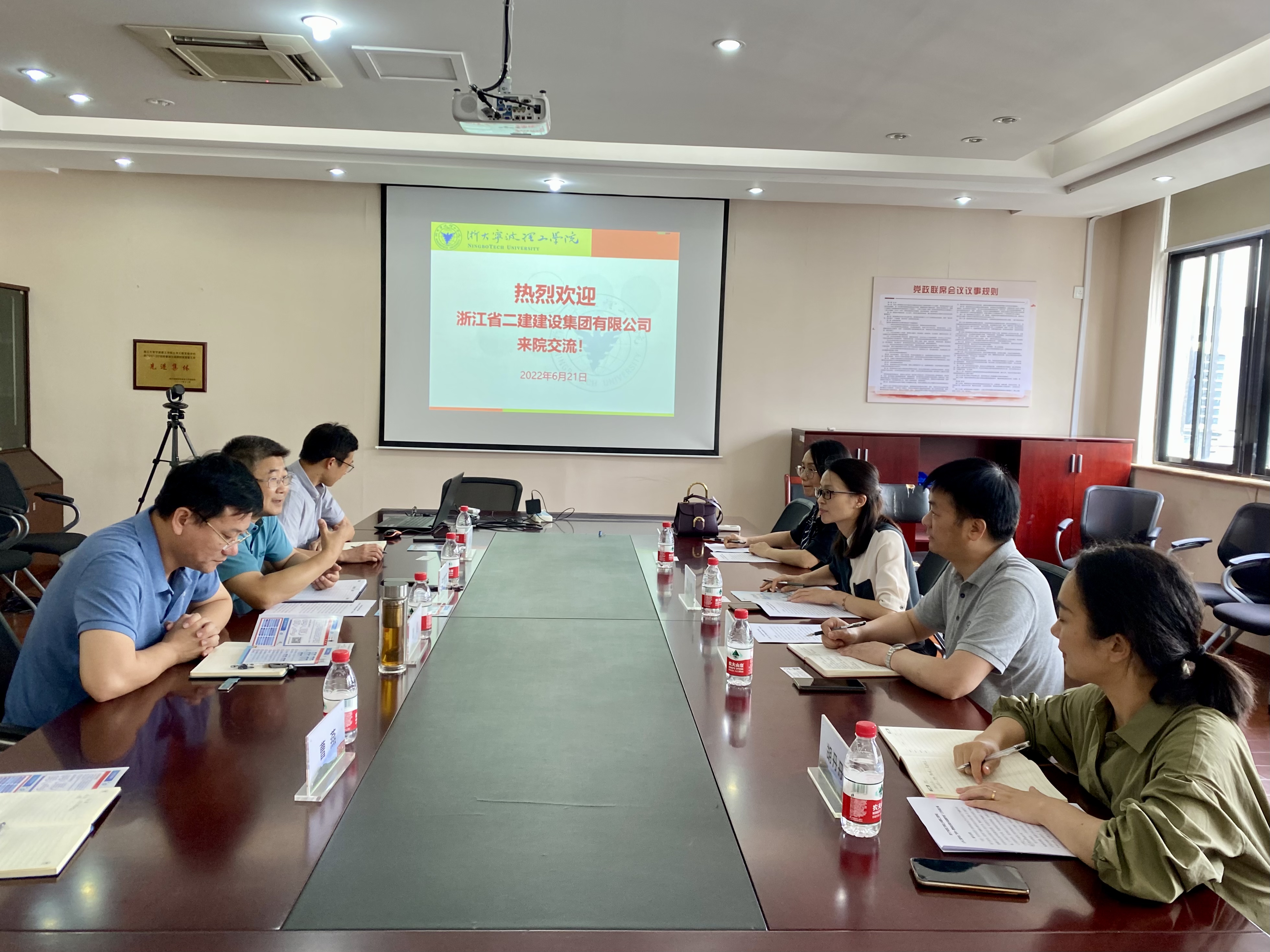 浙建集团党委组织人力资源部副部长陈小娟、二建党委副书记纪委书记陈旭辉、二建工程研究院张利娟、二建组织人力胡丹丹、浙大宁波理工学院土木建筑工程学院党委书记王银辉、副院长耿健、党委副书记邬旭东、思政副主管曹燕参加座谈交流。