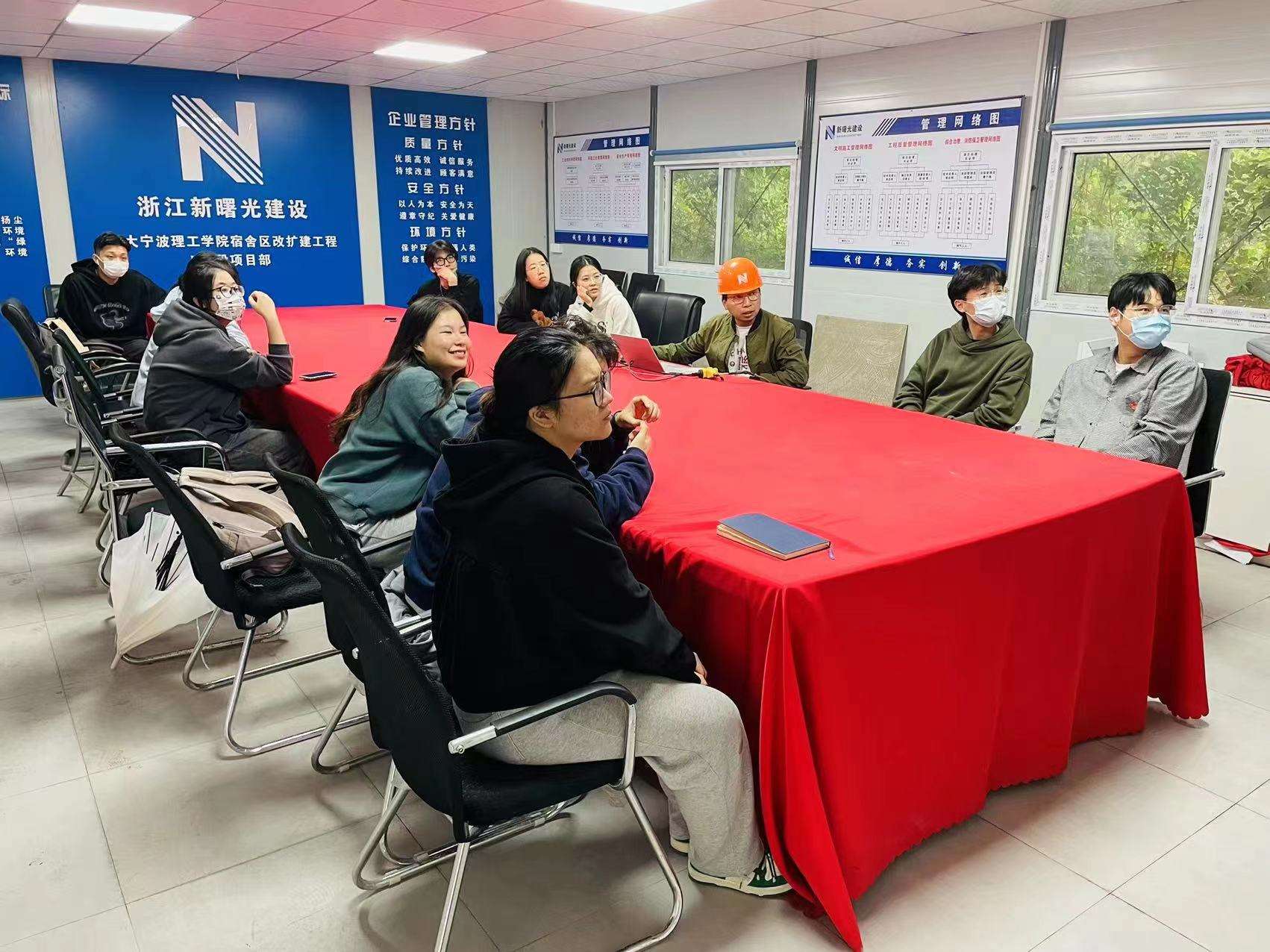 在施工现场,经理首先介绍了新宿舍楼的相关结构,通过将课本知识与实际工程相结合的方式,让学生对新宿舍楼的整体结构有了初步的认识。之后学生分为两组,一组前往参观样板房,另一组在会议室进行座谈。样板房的参观过程中,经理逐一介绍了新宿舍的内部构件,以及如何打造更加舒适的生活环境,并询问了同学们对于新宿舍的看法,学生也提出了相关建议。在会议室座谈时,施工方以图文结合的形式更加细致的介绍了楼层的内部结构设计、工程计划与施工安排,对同学们提出的关于工程相关的疑问予以解答。