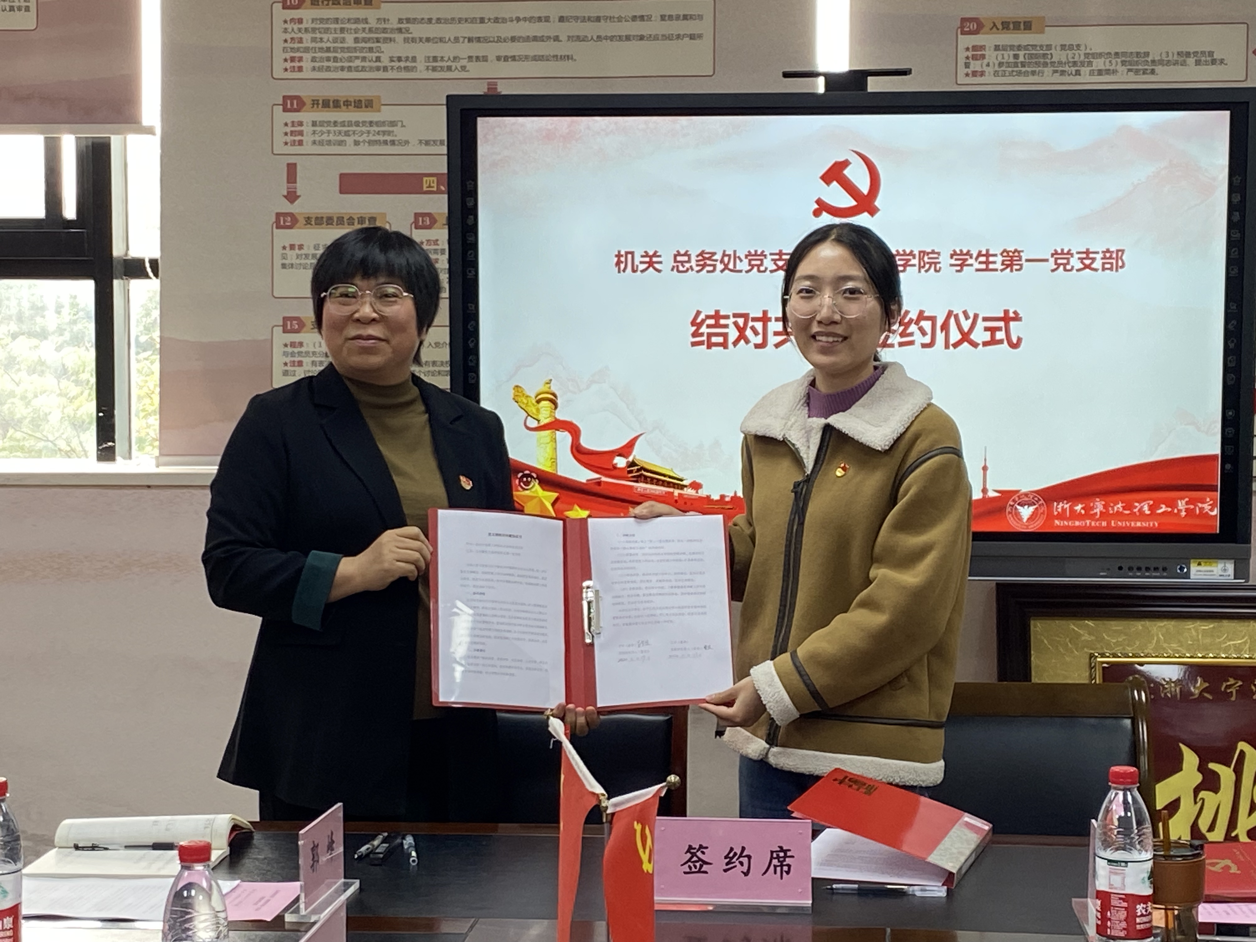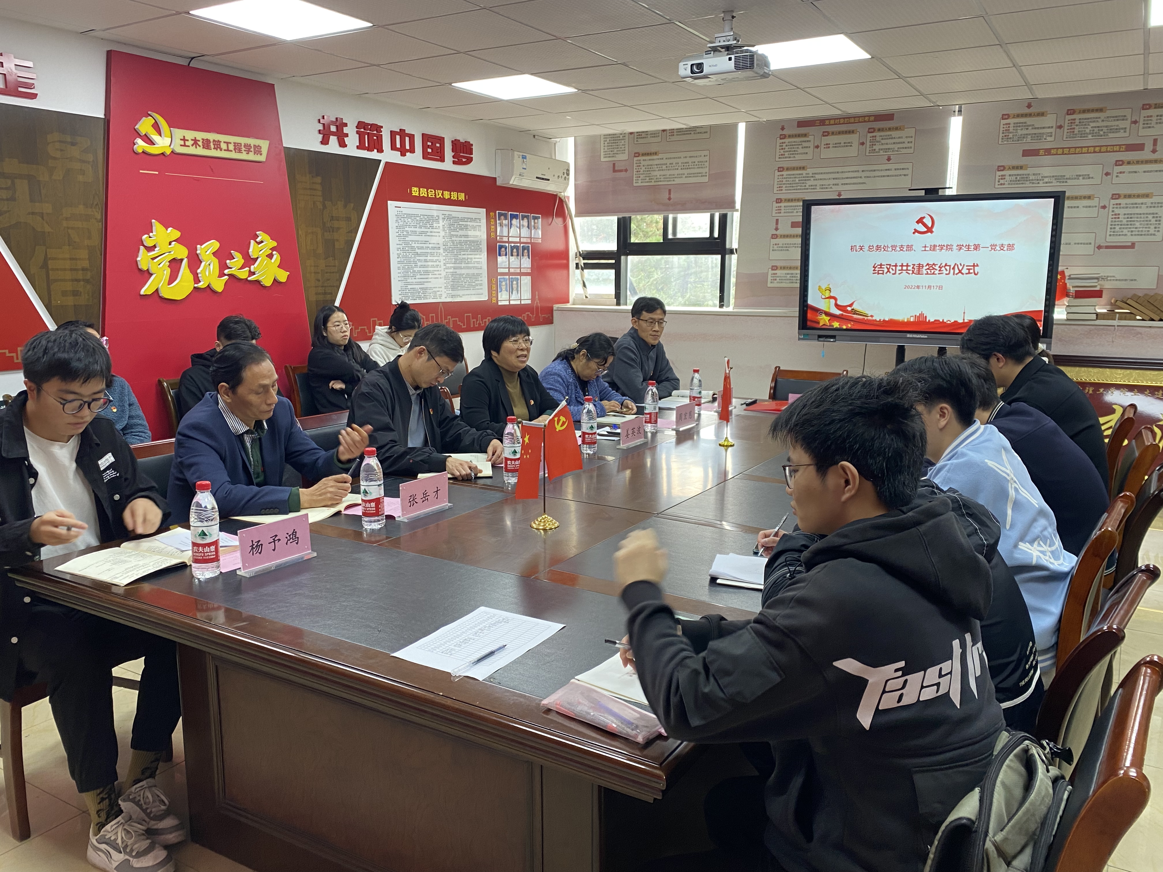 2022年11月17日下午,土建学院学生第一党支部与学校总务处党支部在土建学院党员之家举办共建签约仪式。总务处党支部书记姜英波、副书记兼纪委书记郭峰、土建学院党委副书记邬旭东、学生第一党支部书记曹燕和支部全体党员等参加结对活动。