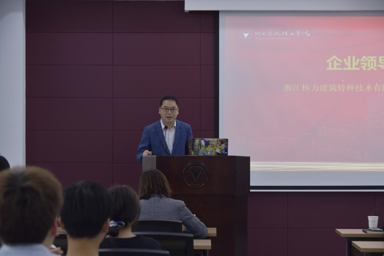 浙江核力建筑特种技术有限公司总经理杨军龙讲话。他对获奖的同学表示了祝贺,他勉励在场的学生干部能够发挥先锋示范作用,带领班级的同学积极向上、争创佳绩,同时也希望没获奖的同学,能够再接再厉、勇往直前,争取今年能够有所收获。他表示,他在土建学院任教期间,土建学院的学生干部也给他留下了深刻的印象,他希望接下去能够进一步加强与土建学院合作的深度和广度。