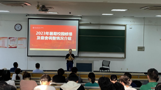 周星老师布置近期学生工作。她首先进行安全教育和提醒,希望同学们能提高反电诈意识,不轻易透露个人信息,同时涉及网络转账交易行为时,务必通过电话、见面等多途径核验对方身份。接着,她勉励大家努力学习,争取在期末考试中考出好成绩。她强调,同学们要诚信考试,杜绝作弊。最后,周老师从学校高质量发展的角度介绍了学校暑期整体寝室修缮安排,专题布置暑期学生寝室搬迁工作。她强调了寝室搬迁过程的注意事项,解答了部分同学的疑惑,希望大家能配合好学校的搬迁工作。