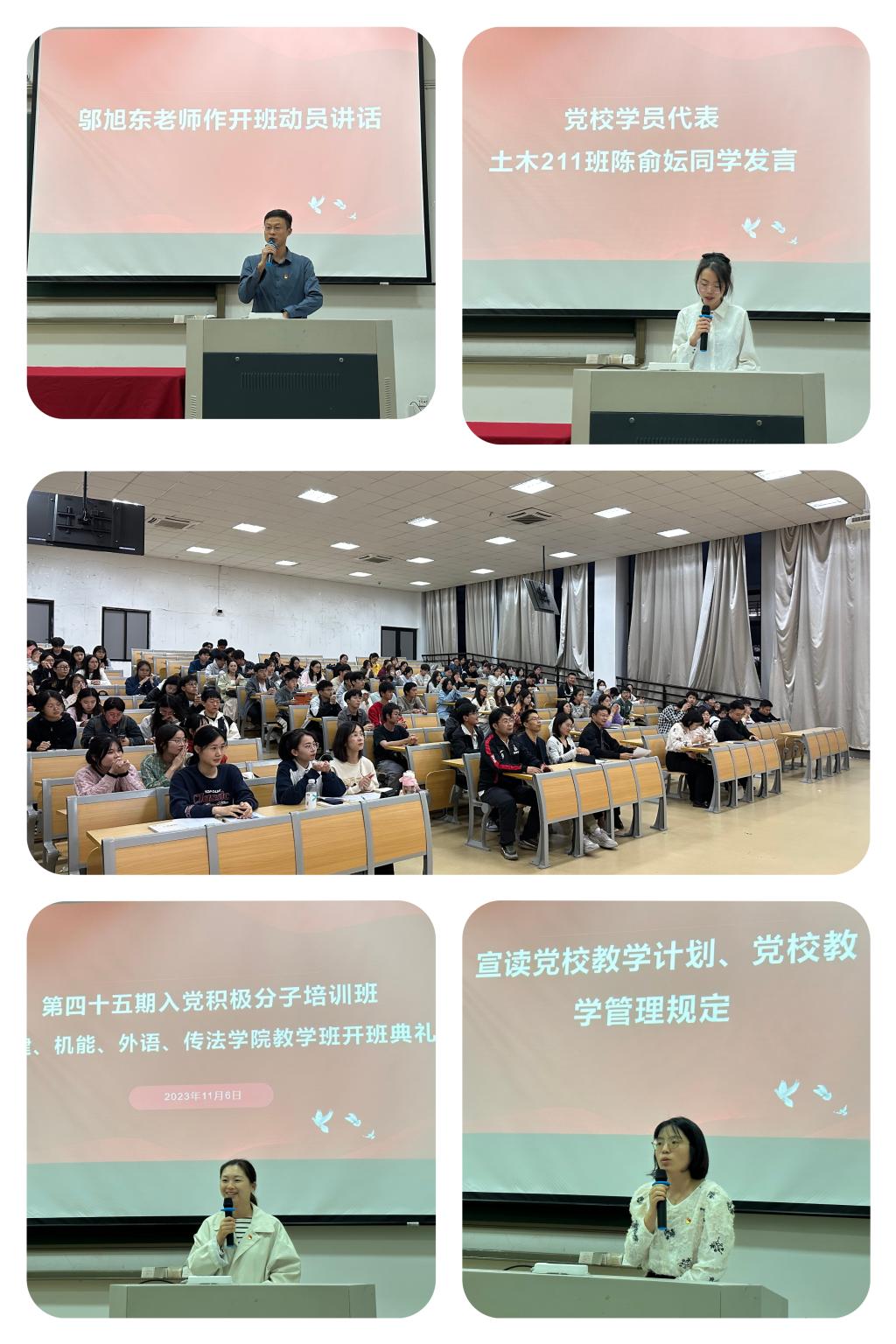 11月6日晚17:30,浙大宁波理工学院党校第45期入党积极分子培训班土建学院、外语学院、机能学院和传法学院党委联合教学班开学典礼在SB104如期举行。土建学院党委副书记邬旭东、外语学院党委副书记任凯、机能学院党委副书记林建英、传法学院党委副书记胡鹿鸣、外语学院思政主管芦美丽、机能学院思政主管刘杜娟、传法学院思政主管曲昊杨、土建学院思政副主管周星出席了活动。活动由周星老师主持。
