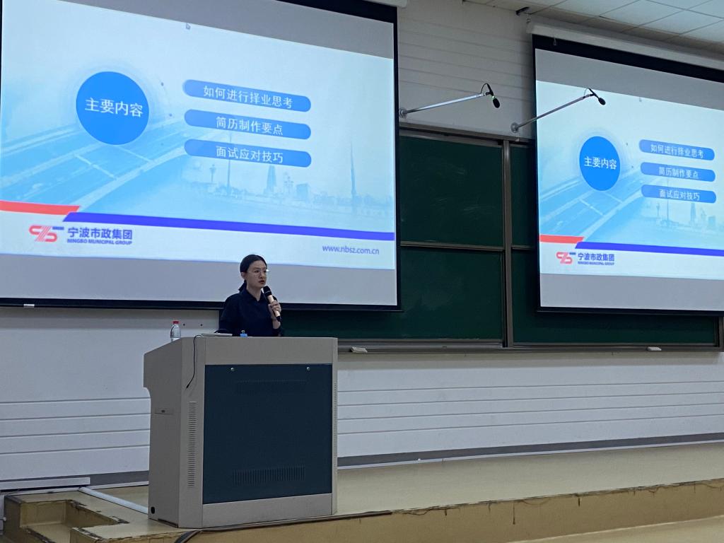 宁波市政工程建设集团股份有限公司人力资源部经理朱文吟为同学们讲解简历制作和面试相关知识。朱经理结合自身的择业经历,向同学们分析如何选择职业,将自我认知、专业认知、职业发展定位几个方面相结合,深入分析职业是否适合自己。她还通过工作中面试的实例告诉同学们怎样准备一份优质的简历,如何在面试过程中提出高质量问题。