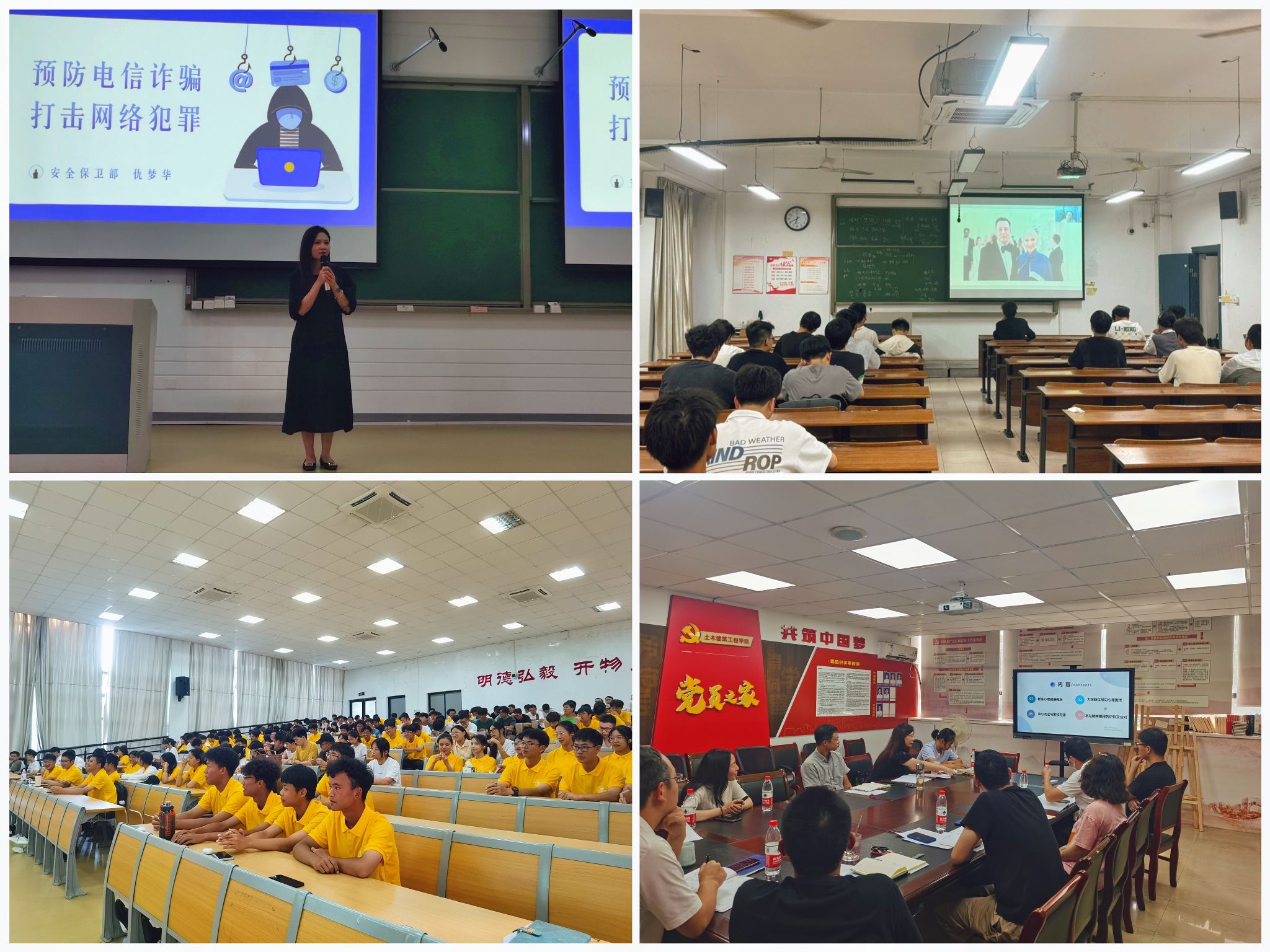 9月12日,学院在SB102开展防范电信网络诈骗专题讲座,旨在帮助新生提高防诈意识,共同筑牢反诈防线,建设平安校园。学校安全保卫部仇梦华老师担任主讲,她结合自身工作经历,深入浅出地向同学们介绍了目前高校常见的几种电信网络诈骗手段,着重讲解了“两卡”犯罪的形式和手段,并向同学们传授了一些防范电信网络诈骗的实用技巧和方法,提醒同学们正确使用网络,加强自我保护意识,不要轻易上当受骗。10月15日晚,学院组织新生参与新生适应讲座,有效疏导学生对大学生活的焦虑和不安情绪,增强同学们的心理健康意识,促使同学们塑造积极乐观的心理素质。