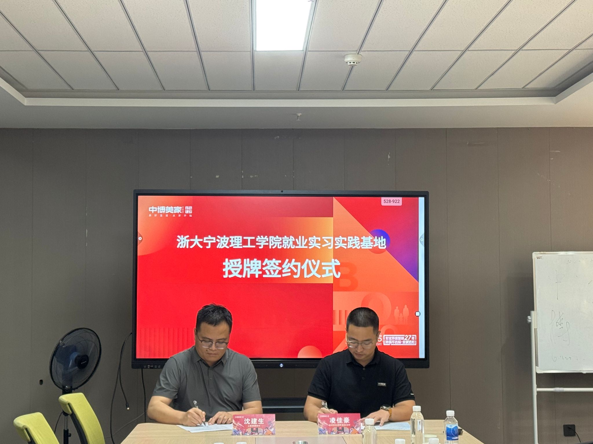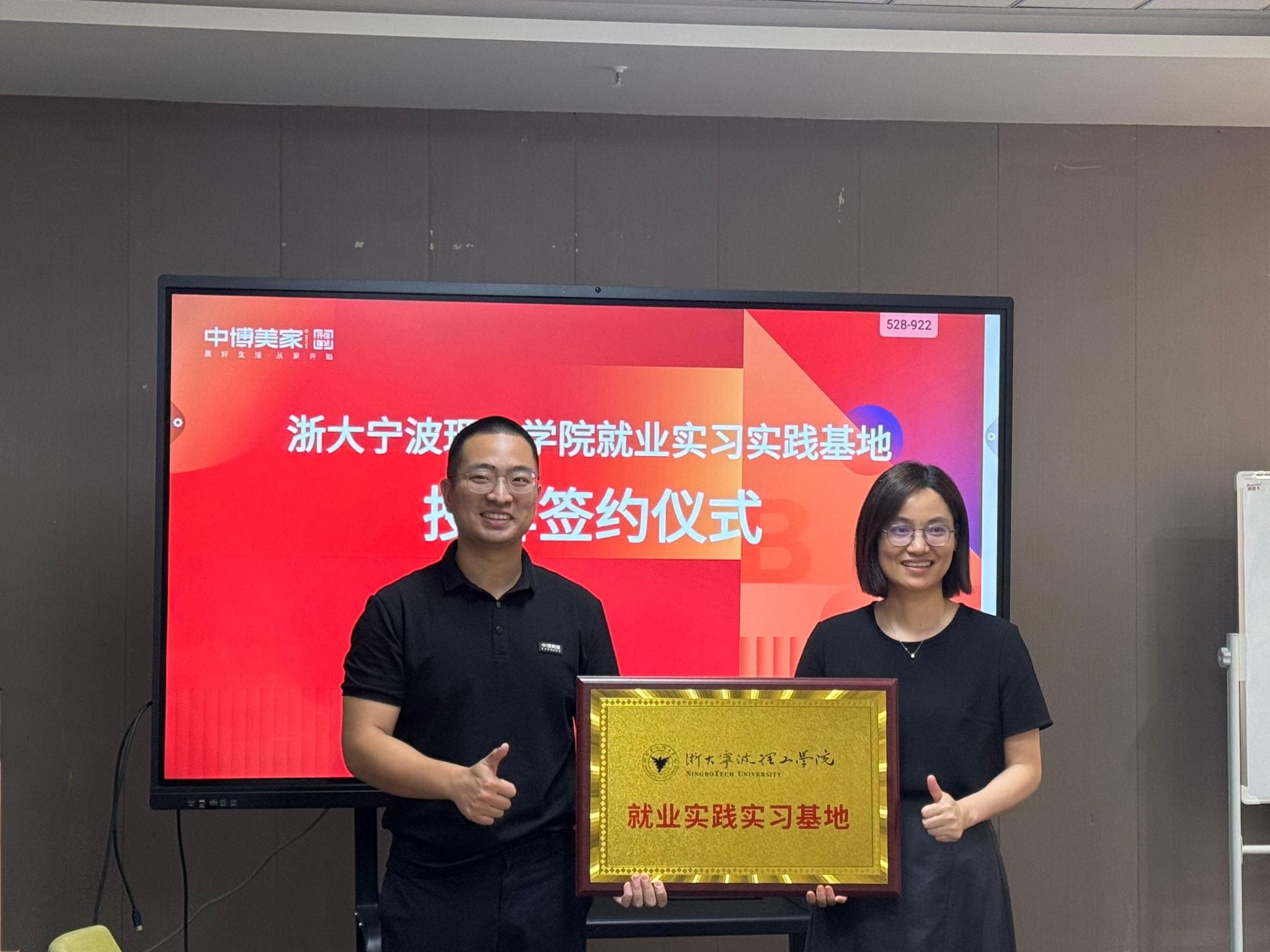 在浙江中博美家科技有限公司,王成、沈建生一行在我院16届校友凌佳豪和彭晓平的陪同下参观了企业展厅,深入了解企业在智能家居、绿色建材领域的创新成果与市场布局。交流中,中博美家公司分享了行业发展趋势及对设计、营销、材料技术等复合型人才的迫切需求。学院党委副书记沈建生与中博美家科技有限公司副总裁凌佳豪签订了就业实习实践基地共建协议,学院党委书记王成为公司授就业实践实习基地牌。双方期待在联合开展人才培养、拓展毕业生优质就业岗位等方面开展实质性合作,实现校企资源的精准对接与互利共赢。